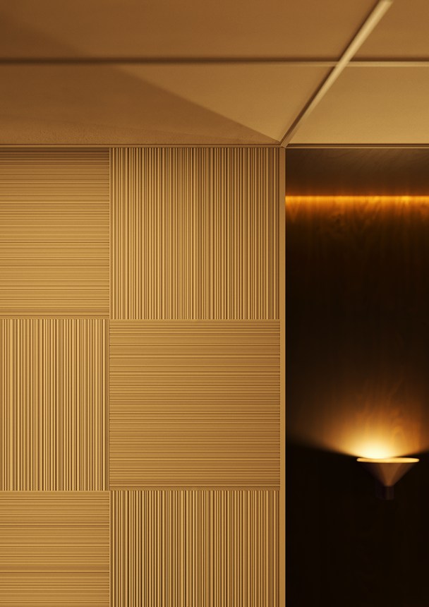 Designed by Belgian product designer Bertrand Lejoly, the ALLEGRETTINO wall panel builds on the expressive language of the ALLEGRETTO design with a more frequent repetition of its linear, asymmetrical motif. This results in a delicate and subtle surface design, ideal to create refined, modern interior decors. The mineral-inspired pattern enhances the interplay of light and shadow, adding unique architectural texture to walls, ceilings, or furniture. ALLEGRETTINO also features cutting guides on the reverse side, allowing the design to be shifted and rearranged—offering extensive customisation possibilities for creative compositions.