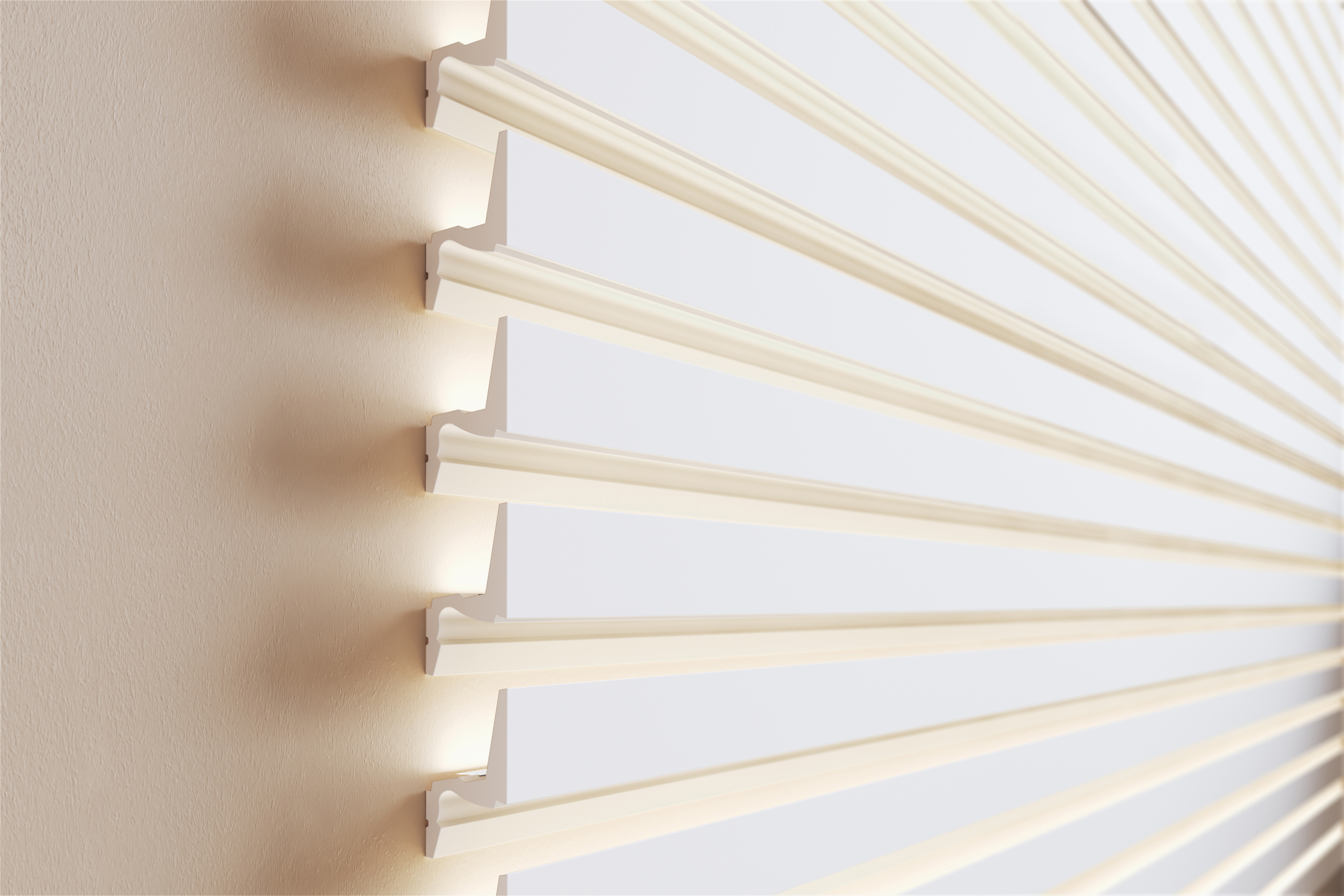 Create a cosy and modern atmosphere by using the IL7 MEMORY coving as an indirect lighting source. The IL7 MEMORY uses the Memory Effect within this contemporary cornice designed by Michaël Bihain. The designer has integrated pre-existing mouldings into a new design. Simplistic lines and geometric shapes either add a touch of lightness to a classic look, or give a traditional touch to a minimalistic interior. In 2020, this creative design was awarded with the Red Dot Design Award. The effect of the LED lighting can be influenced by varying the position of the mouldings on the wall.