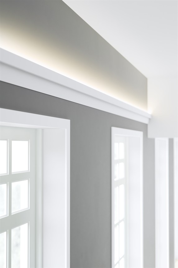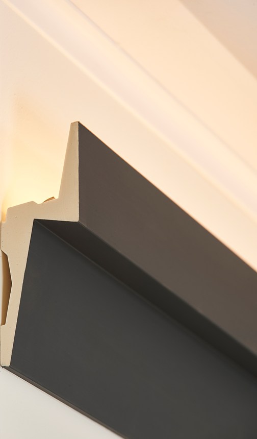 Installing the IL8 is simple as the mouldings arrive primed and ready for painting. To attach the coving just glue each section in place. Behind the top section of the cornice IL8 is enough space to conceal LED lighting strips to produce indirect lighting.