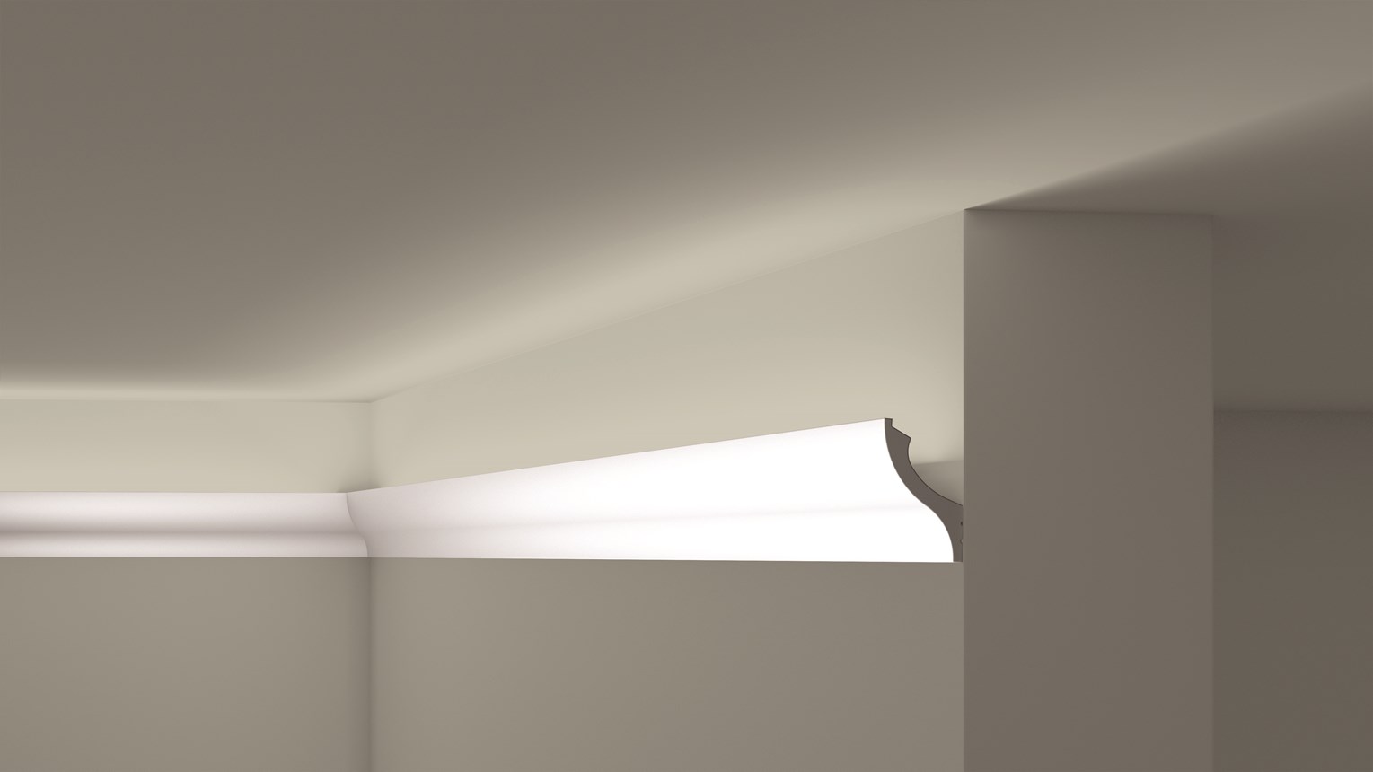 Si desea utilizar iluminación indirecta, cuenta con un espacio de serie en la parte posterior de la moldura para fijar tiras de LED con facilidad. Un núcleo gris ayuda a que el IL13 WALLSTYL® sea opaco, lo que permite focalizar la luz en una dirección. Presenta unos detalles muy cuidados, ya que es fácil de cortar y pegar en su sitio; además, el perfil también está imprimado, listo para la última capa de pintura.