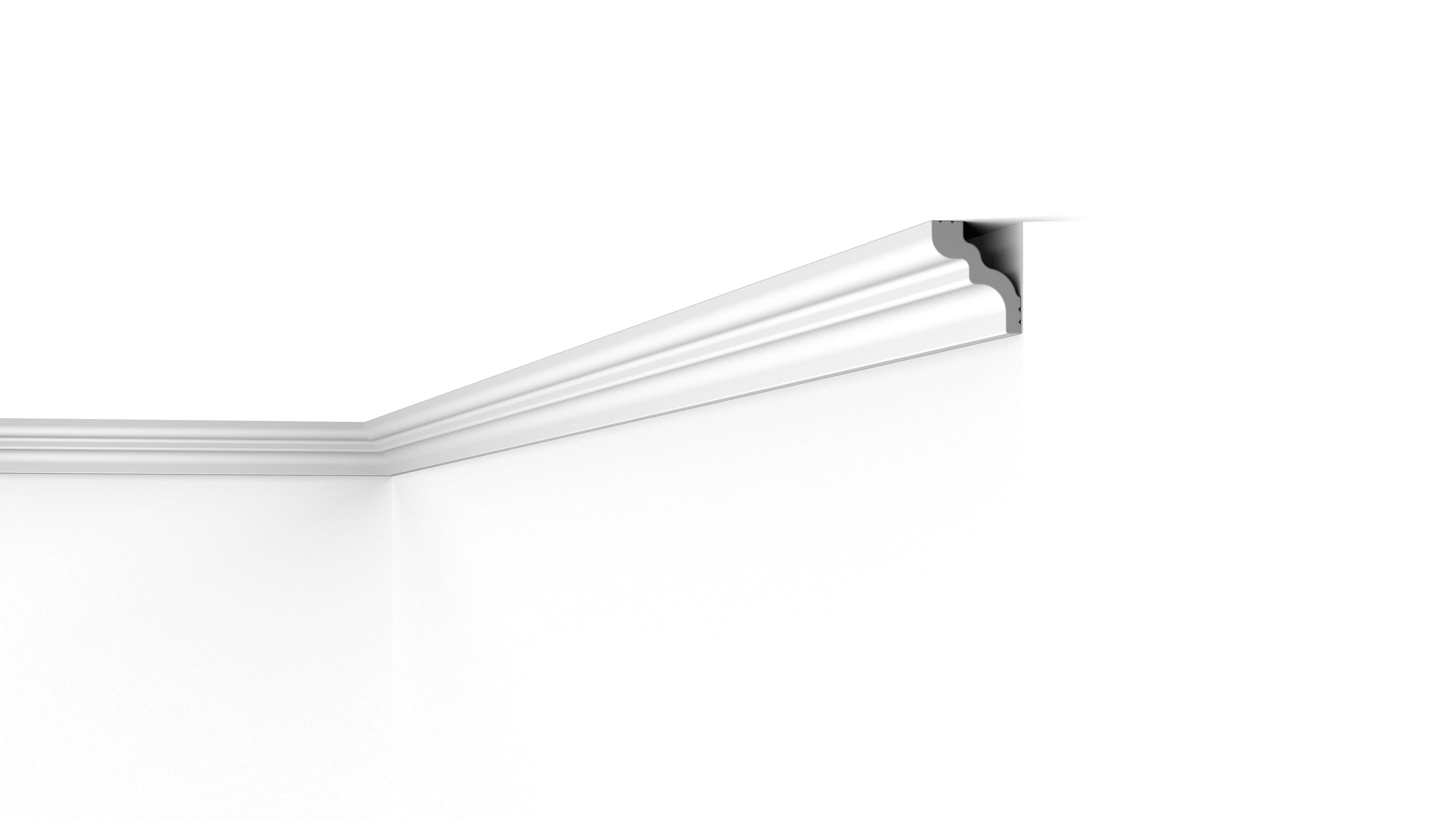 La instalación de la moldura WT9 es rápida y fácil gracias al material duradero y ligero. Las molduras de cornisa se presentan con imprimación y preparadas para la pintura final. Detrás de WT9 hay un pequeño espacio que puede ocultar cables, grietas y transiciones no perfectas.