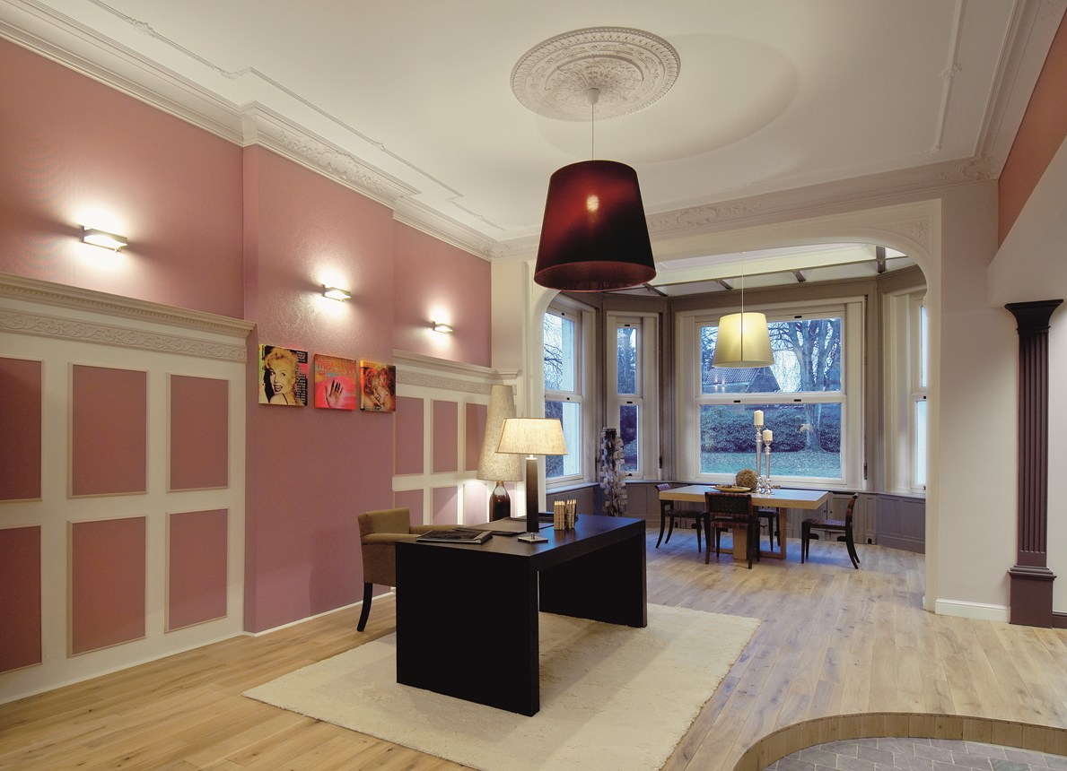 Cornisas, guardasillas, zócalos y decoración mural que se combinan con la iluminación directa o indirecta para crear un ambiente