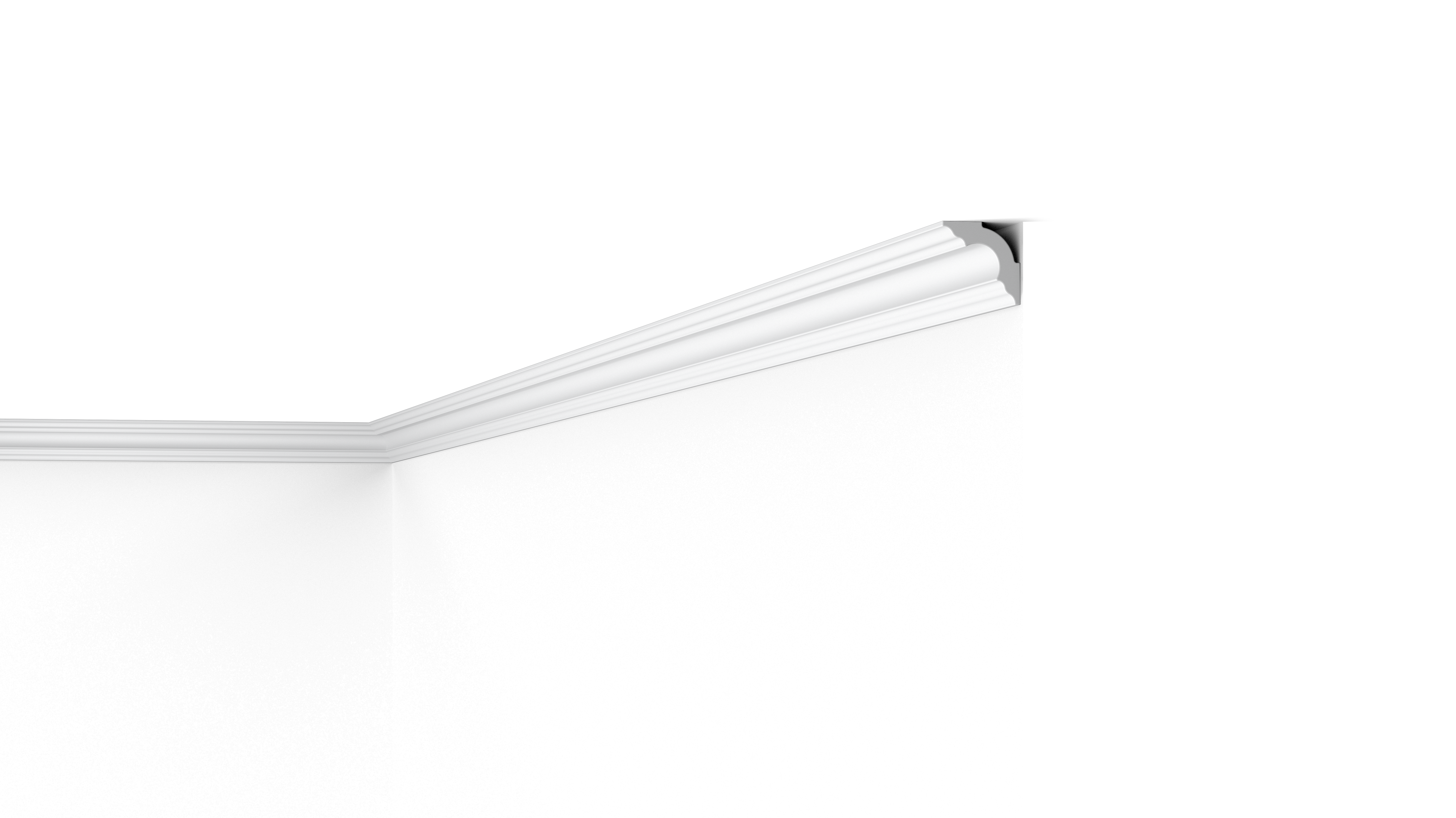 L'installation est facile grâce au polystyrène léger. La moulure de plafond A3 se fixe au mur et au plafond à l'aide de la colle ADEFIX®. Derrière le profilé se trouve un petit espace qui peut être utilisé pour dissimuler les petits câbles et les raccords disgracieux.