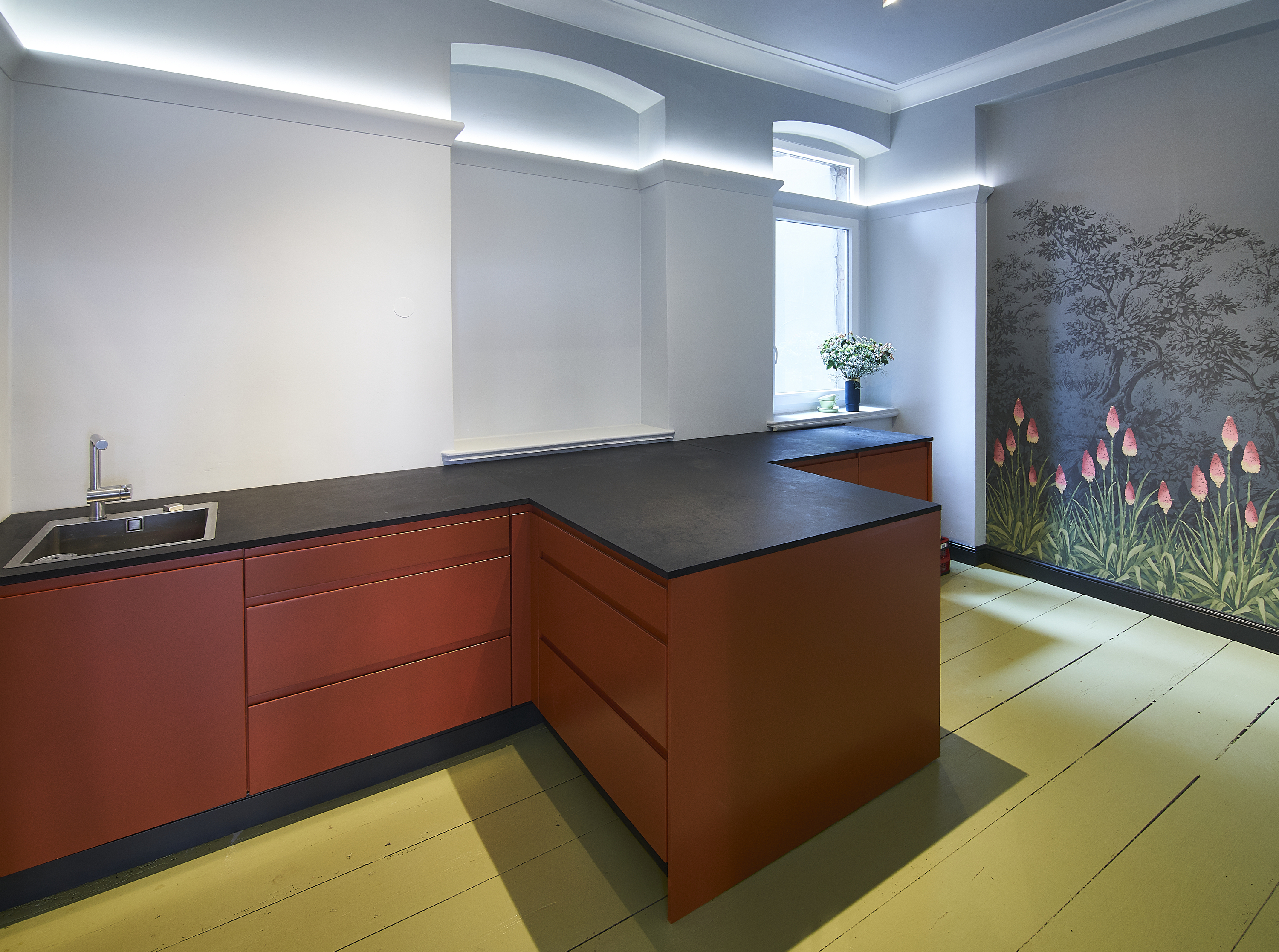 Pour l’éclairage LED indirect, un espace est prévu à l’arrière de la moulure pour fixer les bandes LED. Selon la position choisie, il peut également y avoir de la place pour dissimuler de petits câbles et des imperfections. La IL3 est prête à peindre grâce à la couche de primaire appliquée en usine. Pour la pose, il suffit de coller les moulures à l’endroit désiré.