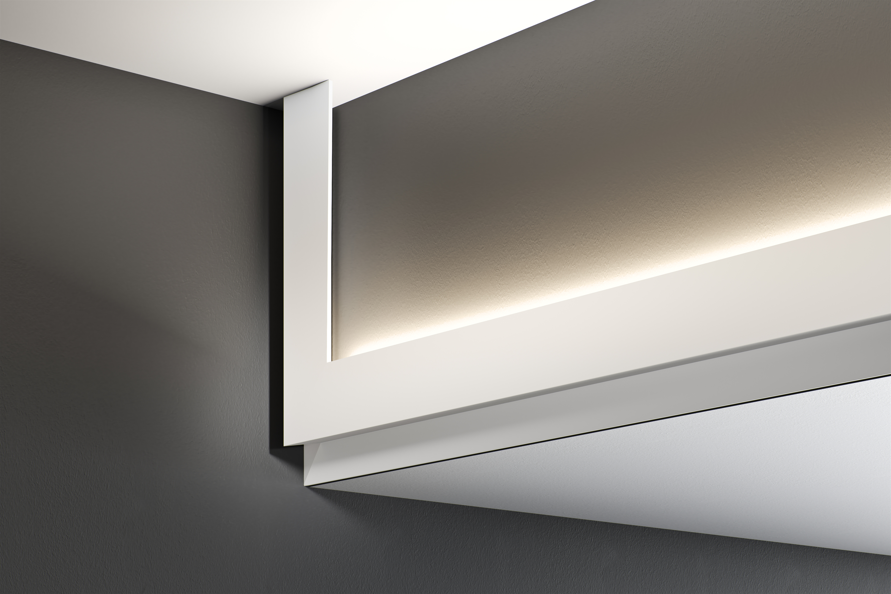 Le profilé pour éclairage indirect IL6 peut facilement être placée dans différentes positions pour modifier l’effet de l’éclairage. L’installation est simple car les moulures sont légères et durables. Les moulures sont prêtes à peindre grâce à la couche de primaire appliquée en usine. Ces moulures sont conçues pour intégrer un éclairage et disposent d’un espace pour dissimuler des bandes LED, créant ainsi une parfaite solution d’éclairage indirecte.