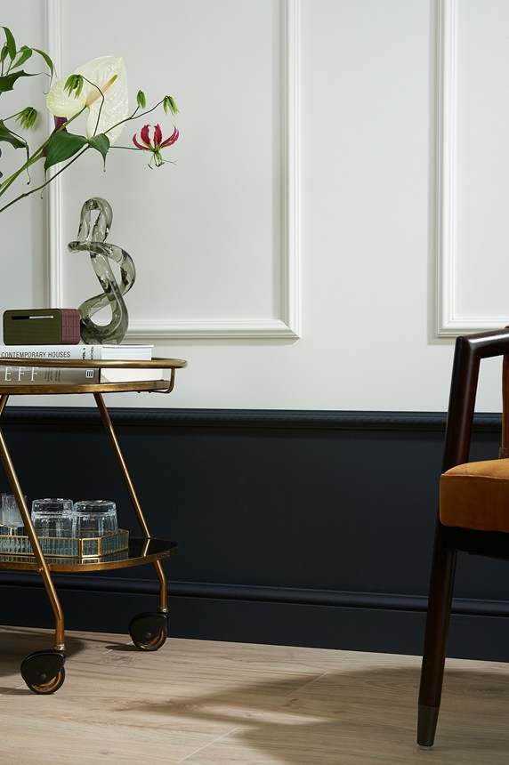 Decoração de parede com painéis de parede, revestimento, rosetas e rodapés para dar um toque moderno ao seu interior.