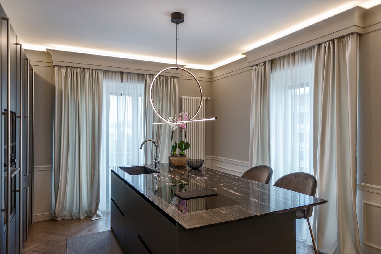 Cornijas, guardas, rodapés e decoração de parede que combinam com iluminação direta ou indireta. Para criar uma atmosfera