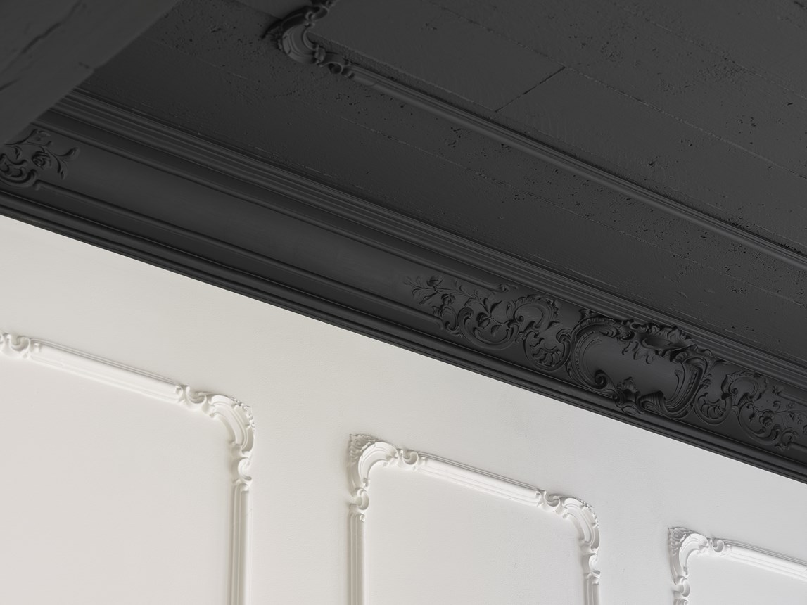 Decoração de parede com painéis de parede, revestimento, rosetas e rodapés para dar um toque moderno ao seu interior.