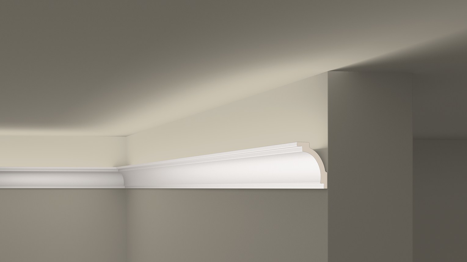 Cornijas, guardas, rodapés e decoração de parede que combinam com iluminação direta ou indireta. Para criar uma atmosfera